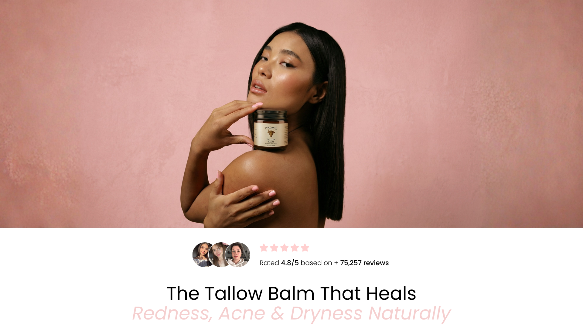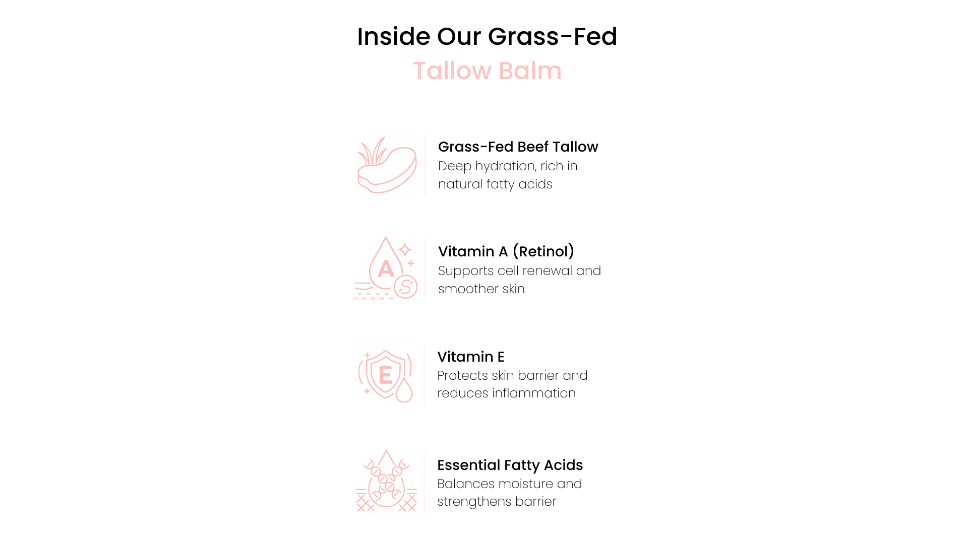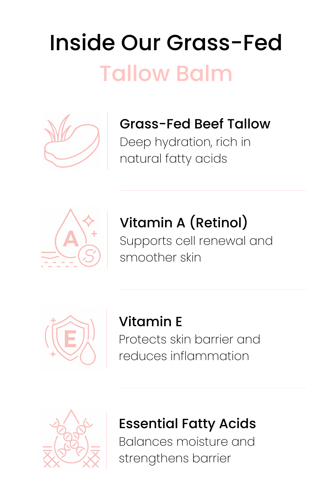 We combine grass-fed beef tallow with skin identical vitamins so you get calm, clear and deeply hydrated skin without harsh actives.